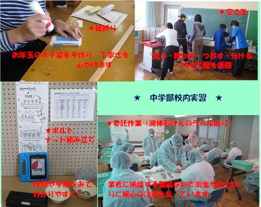 22日までの5日間、ボルトナット・紙折り・空き缶・委託作業の4つのグループに分かれて、集中して作業に取り組みます。毎日の作業学習の授業と違って、一日中の取り組みを5日間継続する経験を就労に向けての大切な経験と考えて取り組んでいます。