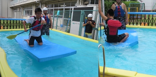 小学部の簡易プールを利用して、水に浮く感覚やパドルさばきの練習など体験しました。