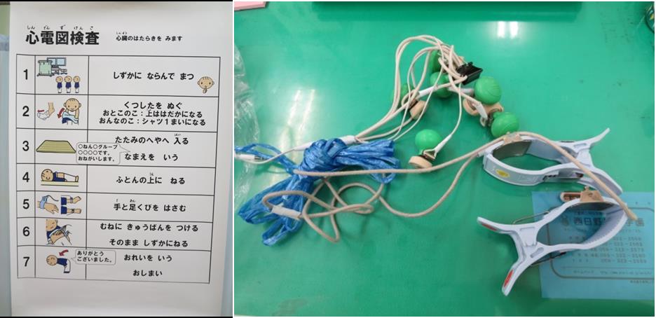検診の中でもハードルが高い心電図検診。早くから対象の児童生徒たちは視覚的・体験的に事前学習を重ねました。5月2日の検診では練習の成果がばっちりで、小学部1年生、4年生も落ち着いて受診することができました。きちんと積み重ね、わかることは本当に大切です。