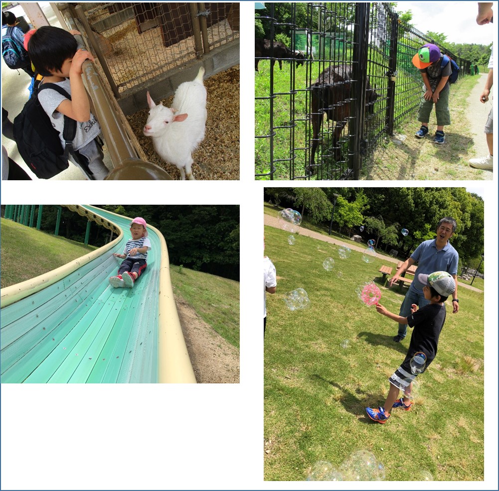 バスに乗って南部丘陵公園に行きました。動物を近くでみたり、長いすべり台をすべったり、広い公園でたくさん遊びました。