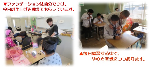 11月20日からの1週間、高3は性の学習に取り組みました。卒業、そして社会への旅立ちを4か月後に控え、大人の身だしなみの1つとして、男子はネクタイの結び方に、女子はお化粧や髪形の整え方について実践的に学びました。うまくネクタイが結べるようになり誇らしげな人や、お化粧で装った自分の顔に「かわいい~ きれい~」と気分を揚げる人多数でした。