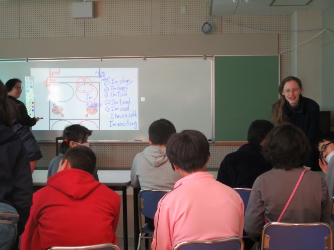午前中から授業や給食等一緒に過ごし、午後は英語活動を学年でしました。今日は簡単なあいさつを教えてもらい、みんなでやり取り練習をしました。