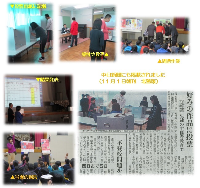 10月30日は高等部で来る1月に実施のにしひの展の宣伝ポスターを選ぶ選挙を行いました。主権者教育の一環としての取り組みでもあり、選挙管理委員会からお借りした本物の記載台や投票箱を使っての投票、終了後は開票作業を全員で見守りました。選ばれたポスターは印刷後、本校と関係の深い学校や施設、あすなろう鉄道の校内等に掲示をお願いする予定です。
