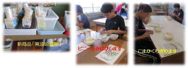 中学部では、学部全員を3つのグループ(園芸・木工・リサイクル)に分け、年間を通じて作業学習に取り組んでいます。写真はリサイクルの活動風景です。牛乳パックを加工して、はがき・カレンダーや廃油吸着剤などを作っています。2学期に入り、みなぐっと落ち着いて集中して取り組めるようになってきています。