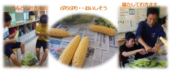 7月12日の給食メニュー「ゆでとうもろこし」の準備として、前日の11日に全校分のとうもろこしの皮を高等部の有志生徒たちがむきました。栄養教諭の先生から、調理の方法や素材の季節のこと、栄養のことなどわかりやすく教えていただきました。