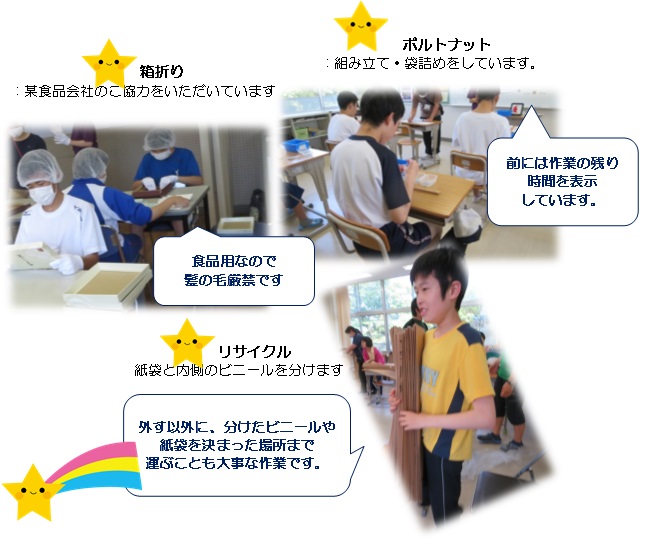5日間継続して同じ作業に取り組みます。中には業者等からの委託作業もあり、緊張感を持って取り組んでいます。卒業後の進路に向けての取り組み第一歩です。