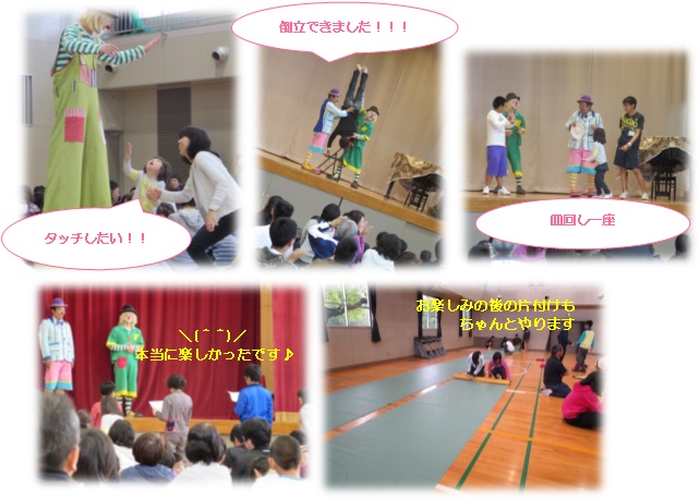 5月10日は全校でクラウンサーカスを楽しみました。小学部から高等部まで子どもたちはノリノリで時にはフロアや舞台でサーカスの曲芸に参加しました。お礼のことばで楽しかった気持ちをしっかり伝えました。
