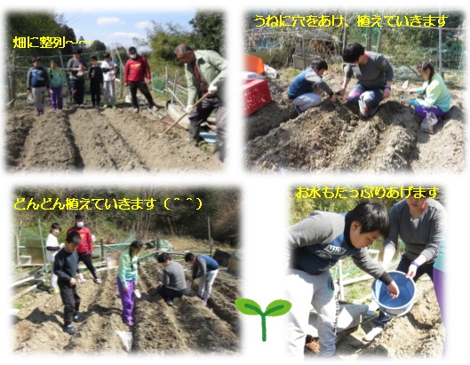 3月15日は、学校近くの方の畑にジャガイモを植えに行きました。ご厚意で畑を提供していただいて