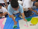 白鳥中の1年生の友だちと共同制作を行いました。12分割された各パーツを作成し、最後に貼り合わせて一枚の大きな壁画にします。完成した作品は、各校の文化祭で展示されます。制作の合間にはお話もできました。 |