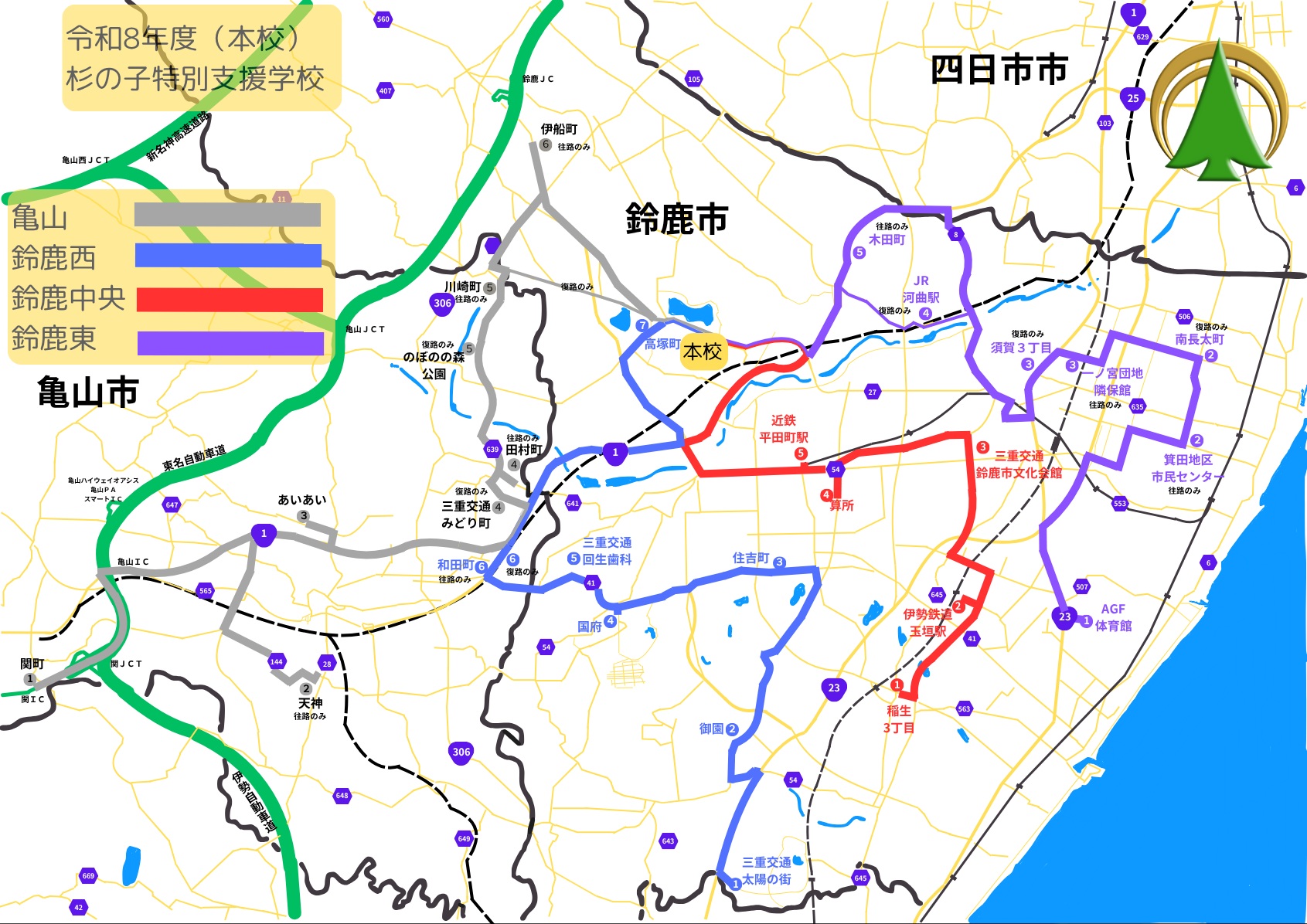・令和8年度 タイムテーブル ・令和8年度 ルート ・三重交通鈴鹿車庫の案内図(鈴鹿中央) ・スクールバスのきまり・・・・・(日本語) (Português) (Español) ・「バス乗車連絡シート」について(About “Bus contact sheet”) ・児童生徒の命を守るために(添乗業務のガイドライン) Copy