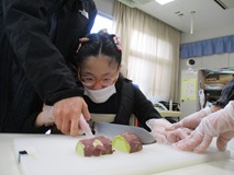 中学部では、家庭科の時間に焼きいもを調理しました。水洗いをした後、「魔法の焼きいも鍋」というグッズと電子レンジだけを使用。これだけの道具で、短時間の仕上がり、まさに魔法のように美味しい焼きいもが出来上がりました!
