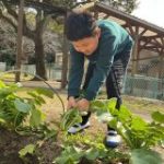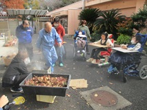 数日後、高等部さんが中庭で、もみ殻や落ち葉を使った本物の焼きいもを作るということを聞きつけて、中学部も混ぜてもらうことにしました。じっくり時間をかけ、煙だらけになりながら焼いてくださったおかげで、香ばしい焼きいもをいただくことができました。