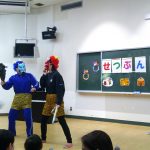 節分にちなんだ「まめまき」の歌を歌ったり、「おにのパンツ」の曲に合わせてダンスをしたりして楽しい時間を過ごしました。その後、2人の鬼が登場し、子どもたちは新聞紙で作った豆を一生懸命鬼にめがけて投げ、鬼を追い払いました。最後に鬼と一緒に記念撮影をして、仲良くお別れしました。