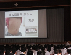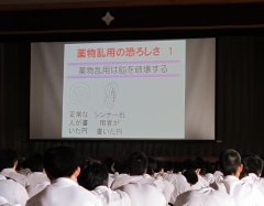 先ず始めに、医薬品についてのお話を聞き、その後、麻薬・覚せい剤・最近大きな問題になっている危険ドラック等薬物に対する正しい知識と乱用の恐ろしさを学びました。講演実施後のアンケートでは、「改めて、薬物乱用の怖さを実感した」「誘われても断る勇気を持とう」等の感想が多く書かれていました。