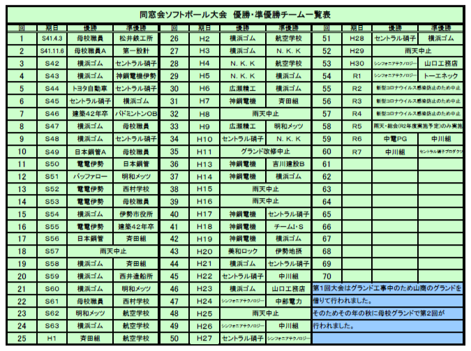 令和7年10月18日 (土) AM8:30開始の同窓会ソフトボール大会にご参加くださいました同窓生の皆様ありがとうございました。試合途中に雨が降り足元の悪い中、びしょ濡れになりながらも試合を続行していただいた選手の皆様お疲れさまでした。決勝戦が雨で出来なかったため、9人対抗じゃんけん大会を行いました。結果は下記のとおりです。 優 勝 中川組 準優勝 セントラル硝子プロダクツ 3 位 山口工務店 4 位 中部電力パワーグリッド 5 位 中部電気保安協会