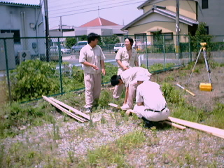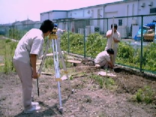 1,現地の測量・・・・・工事を行うために地盤の高さや角度を測ります。