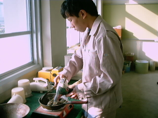 2.吸水させた細骨材を時々かき回せながら均等に乾燥させる