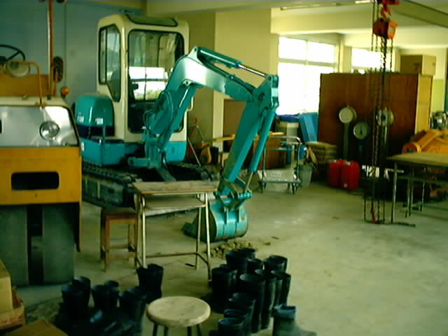 施工実験室です。この部屋は土木施工における材料(セメント・骨材)などの試験や実験を行います。おや?小型のバックホウが見えますねー、これは3年次になれば操作の仕方を教わり自分で動かすこともできます。他にもタイヤローラーも見えます。土木はやっぱりスケールが大きいなー