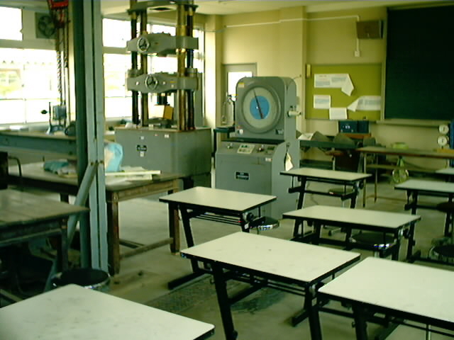 材料実験室です。ここではコンクリートや鉄筋などの様々な材料の力学的な実験をします。万能試験機やミハエリス試験器、などの試験装置があります。