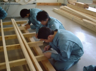 カットした木材に組み合わせ位置にけがきを行います けがきした木材の位置にほぞを入れていきます。 ほぞを入れることで各木材間の組み合わせがしっかりしたものになります