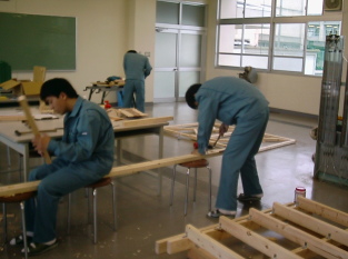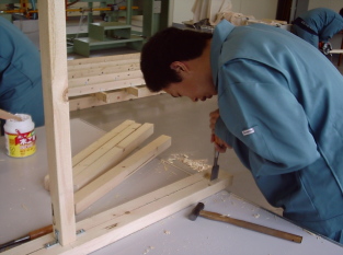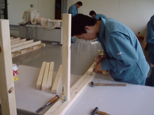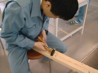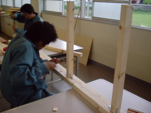 ほぞの加工を行い木材を組み合わせていきます。 高覧部(いわゆる手すりのところ)の加工です。