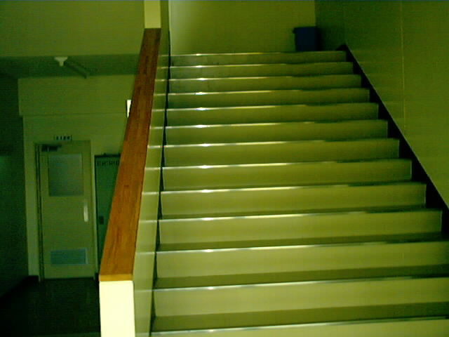 新館実習棟1Fの玄関に着きました。前には2Fと続く階段が見えます。左側の部屋は水理実験室です。右側の部屋は家庭科調理実習室です。
