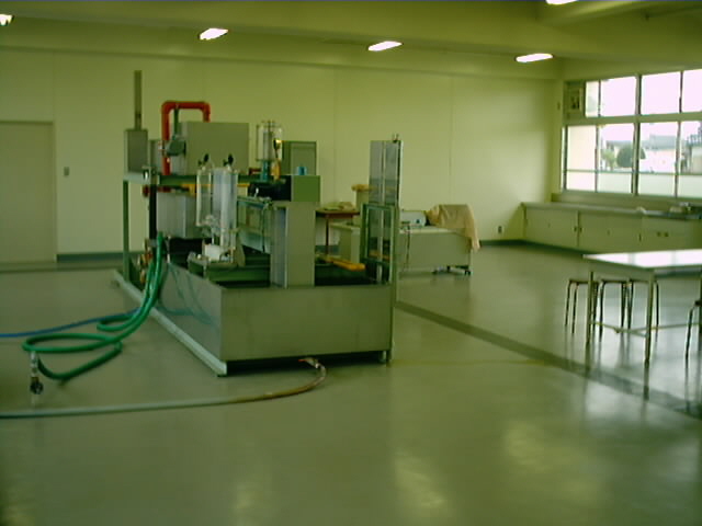 水理実験室です。ここでは河川構造物、港湾構造物などの治水・利水に関係ある工事の計画や設計施工の技術的な資料を得るために行います。ここでは三角堰の流量検定試験やピトー管による円管内の流量分布の測定試験などを行います。