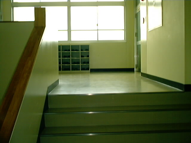 新館実習棟3Fに着きました。正面には製図室専用のサンダルがあります。向かって右側が設計実習室になりす。左側が製図室です。