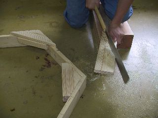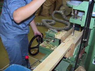 マガジンラックの背板に使う材料を切り出します。 椅子の背もたれを組むためにほぞ穴を作っています。